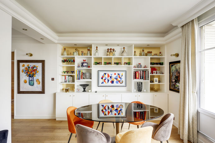 Description: Rénovation complète d'un appartement de 80 m2. Ouverture de la cuisine sur l'espace salon / salle à manger. Luminosité assurée grâce au choix des coloris blanc et doré dans la cuisine et la bibliothèque sur-mesure du salon. Du parquet et mobilier en chêne pour conserver un esprit chaleureux. Une salle de bain repensée en noir et blanc.