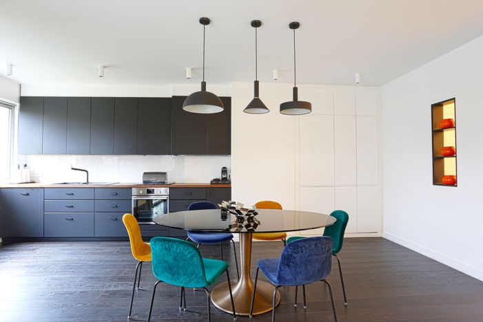 Description: Rénovation complète d'un appartement de 80 m2. Ouverture de la cuisine sur l'espace salon / salle à manger. Appartement très masculin avec la prédominance du noir: son parquet foncé, la cuisine et la salle de bain. Jeux de géométrie grâce aux suspensions dans l'espace salle à manger et la bibliothèque sur-mesure.